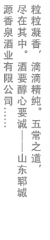山东源香泉酒业有限公司建于2012年,经过几年的努力,已发展成为山东较大的白酒生产公司之一。公司占地面积15多亩,拥有窖池100多个,自有固体酿酒班6个。公司经过多年的沉淀现在技术力量雄厚,酿造设备先进,检测设备齐全,具有年生产高粱基酒500多吨的生产能力,形成了以浓香、酱香、清香、芝麻香、五粮香等五大香型的产品生产结构。公司历届领导坚持“精心酿酒,诚信做人”的原则,严格按照传统工艺和现代改革的科学方法进行生产。从选粮、做曲、粉碎、发酵、蒸馏、分级取酒到分级储存形成了一套规范的生产流程。 生产的五类香型基酒产品均以优质高粱为主要原料,由优质小麦大麦豌豆做成高温、中温、低温三种大。曲为糖化发酵剂,利用多年的老窖池、泥池发酵。